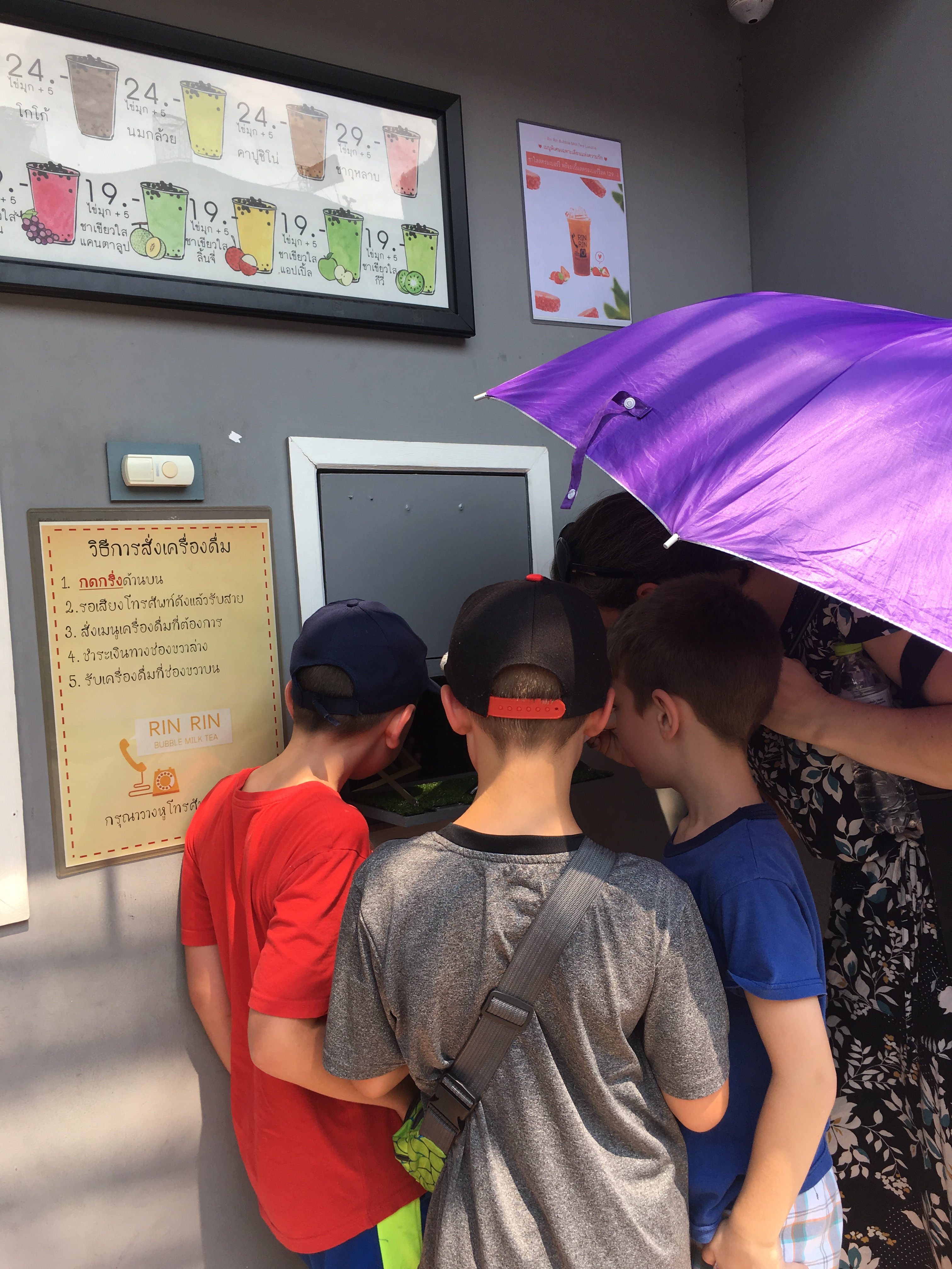 Wednesday not much happened. We walked to a sandbox and dug to the bottom. Later we walked to a bubble tea place called “Rin Rin”. it was interesting because there was a telephone on the wall that you order from,and then they open a flap put a basket out that takes your money and then the flap opens again and they give you what you ordered.